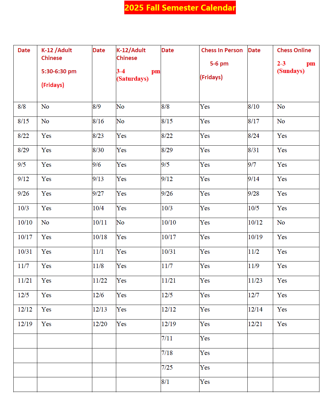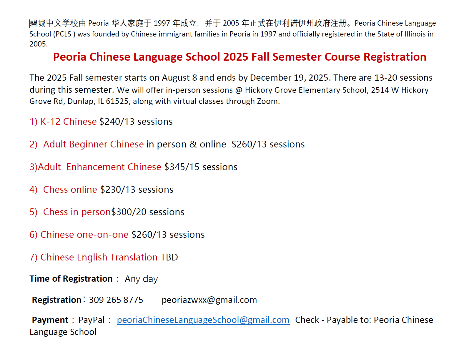 2025秋季学期从八月八日至十二月二十日结束。我们提供线上线下并行的授课。线下课程将在 Hickory Grove Elementary School (2514 W Hickory Grove Rd, Dunlap, IL 61525) 进行。