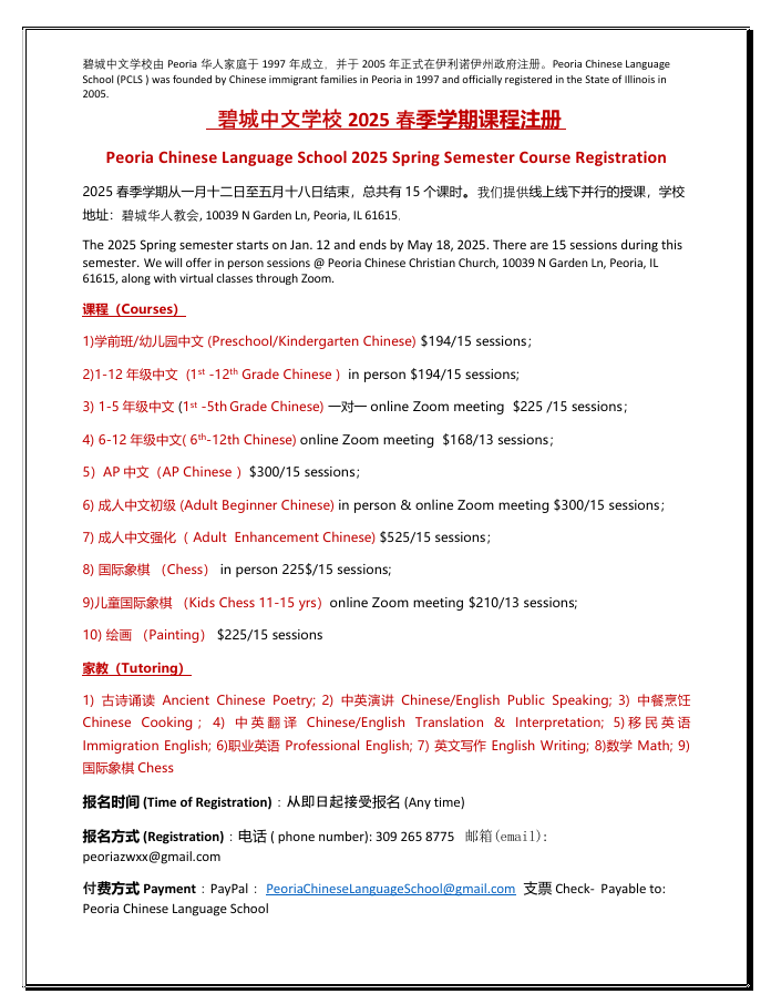 The 2025 Spring semester starts on Jan. 12 and ends by May 18, 2025. There are 15 sessions during this semester. We will offer in person sessions at Peoria Chinese Christian Church, 10039 N Garden Ln, Peoria, IL 61615 , along with virtual classes through Zoom.
