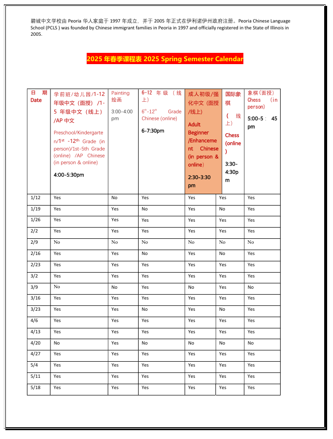 Peoria Chinese Language School 2025 Spring Semester Registration Open Now