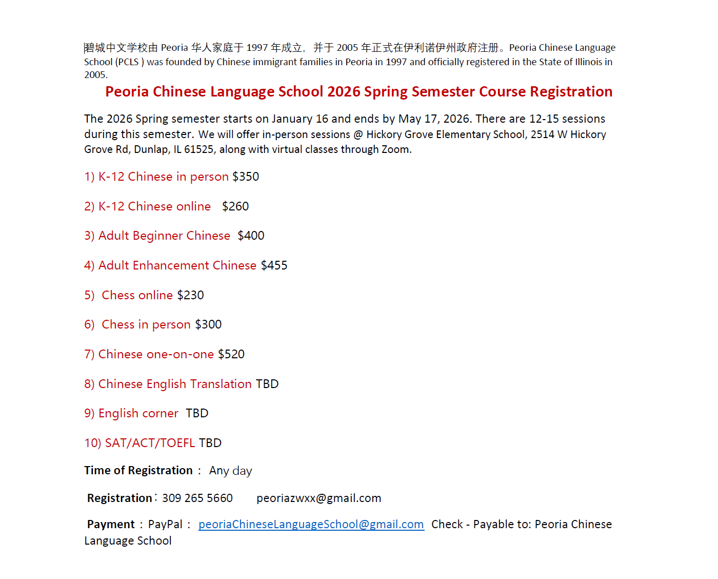 报名方式:请发邮件到 peoriachinese@gmail.com