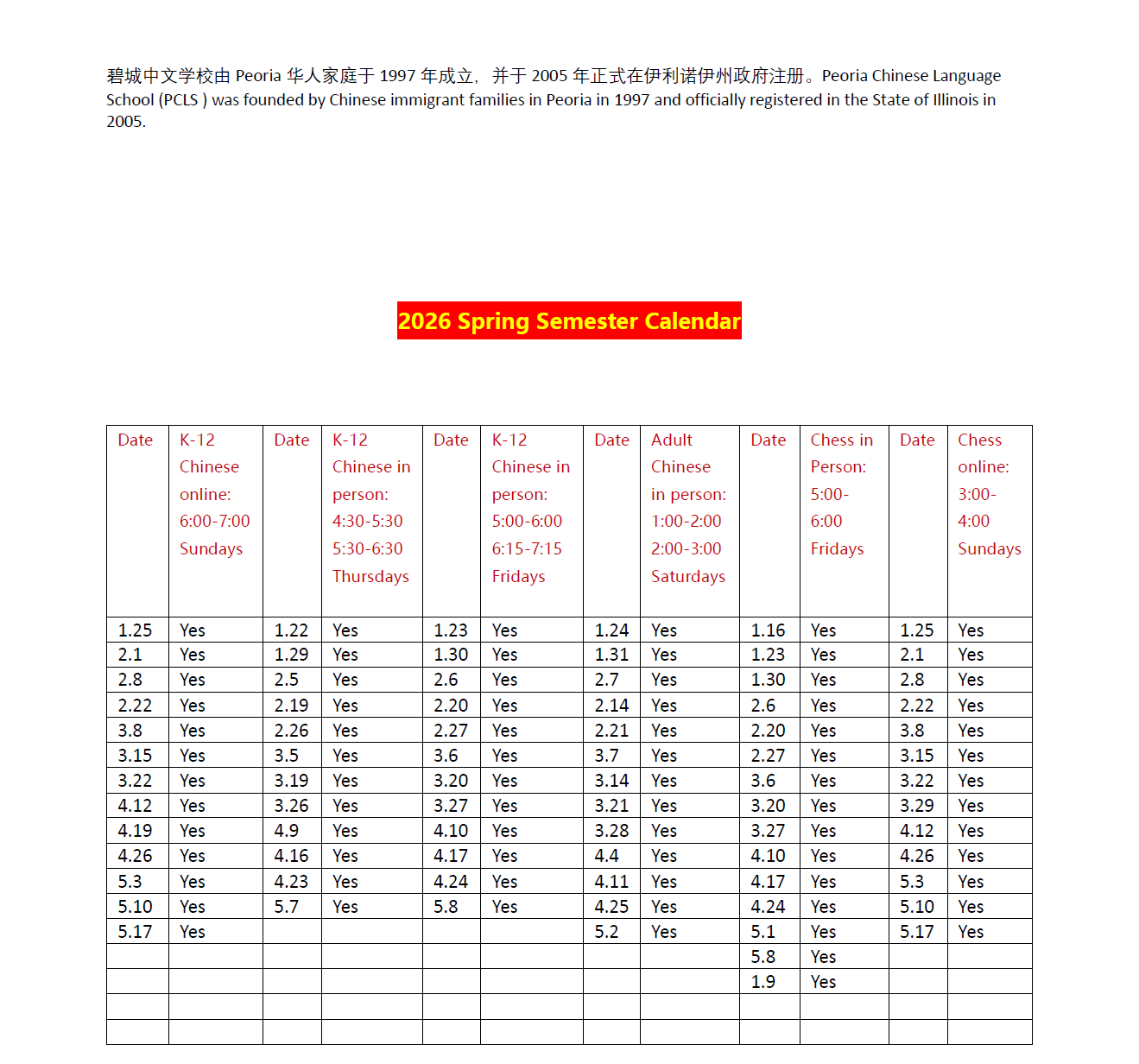 Peoria Chinese Language School 2025 Spring Semester Registration Open Now